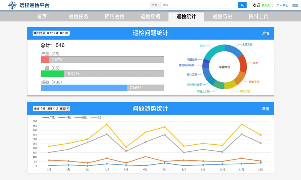 巡檢數(shù)據(jù):巡檢任務(wù)的統(tǒng)計(jì)、巡檢問題的統(tǒng)計(jì)、問題趨勢(shì)的統(tǒng)計(jì)。
